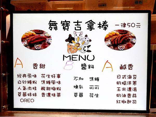吉拿棒的口味超豐富,鹹甜加總一共14種,全品項均一價$50,還免費提供沾醬。老闆說有些媽媽不想讓小朋友吃太甜,所以原味和簡單搭配白砂糖的口味人氣也不低。「舞寶吉拿棒」的產品,奶蛋素的朋友也可以享用喔~