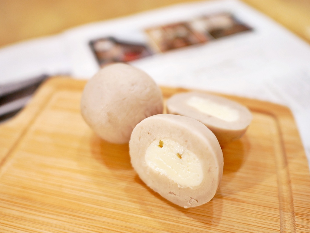 蜂蜜生乳的內餡是蜂蜜生乳酪,多了夾餡的芋泥球濕潤度大大提升,風味也更有層次。除了芋頭的香氣之外,還能品嘗蜂蜜生乳的淡淡酸香感,有點像優格很解膩,內餡香甜滑順不膩口超加分。