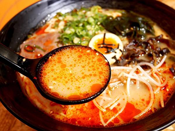 充拉麵的地獄拉麵有大中小辣之分,老闆說麻辣醬是他們自製的,跟台式辣油的風味略有不同。小辣湯頭不鎖喉,有點像麻辣鍋的香氣但不死鹹,拉麵湯雖然不算超濃郁重口但風味還不錯很耐喝。