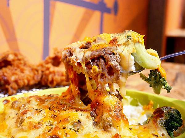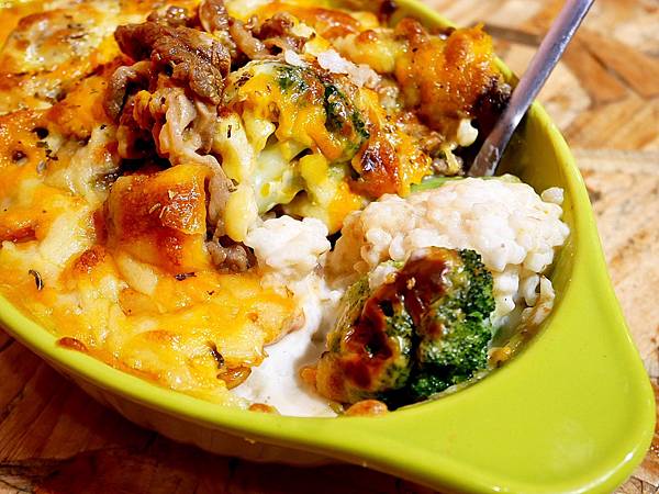 這款焗烤的牛肉鋪滿滿,起司一翻開底下的肉多到看不見飯有點狂。牛五花軟嫩不乾柴,提前抓醃過蠻夠味單吃就很鹹香,搭配底下調味不重的飯剛剛好。