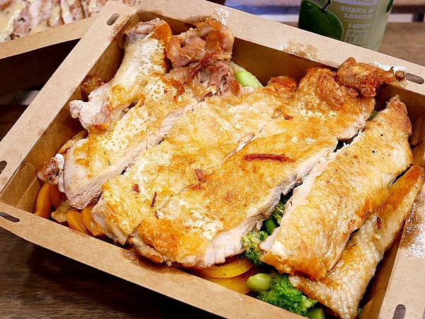取餐時被雞腿排的size驚喜到,幾乎跟餐盒一樣寬份量十足~ 雞皮煎到金黃酥香不乾口,而雞肉細緻濕潤我蠻喜歡。