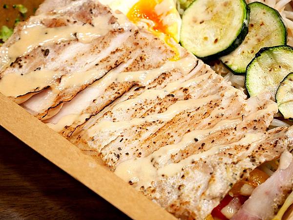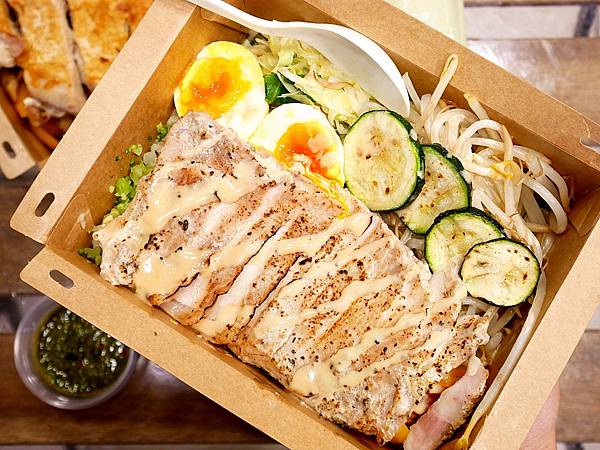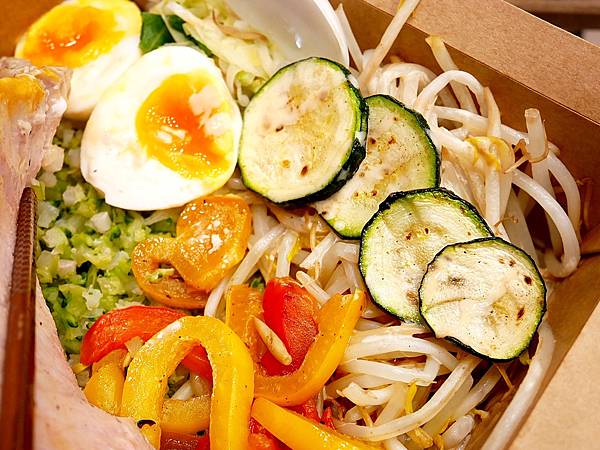 這份的配菜選了彩椒、櫛瓜、豆芽菜、時蔬和溏心蛋,其中時蔬以當天店內提供的品項為主,細緻濕潤的溏心蛋(+$15)口感很棒蠻值得點。