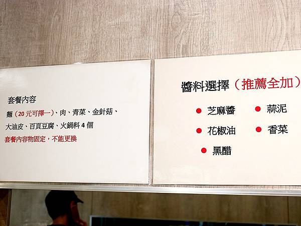 套餐可以自選 $20的麵食,其他內容固定,包含肉、青菜、金針菇、大油皮、百頁豆腐和火鍋料4個,份量意外還不少,很適合第一次拜訪嘗嘗鮮。