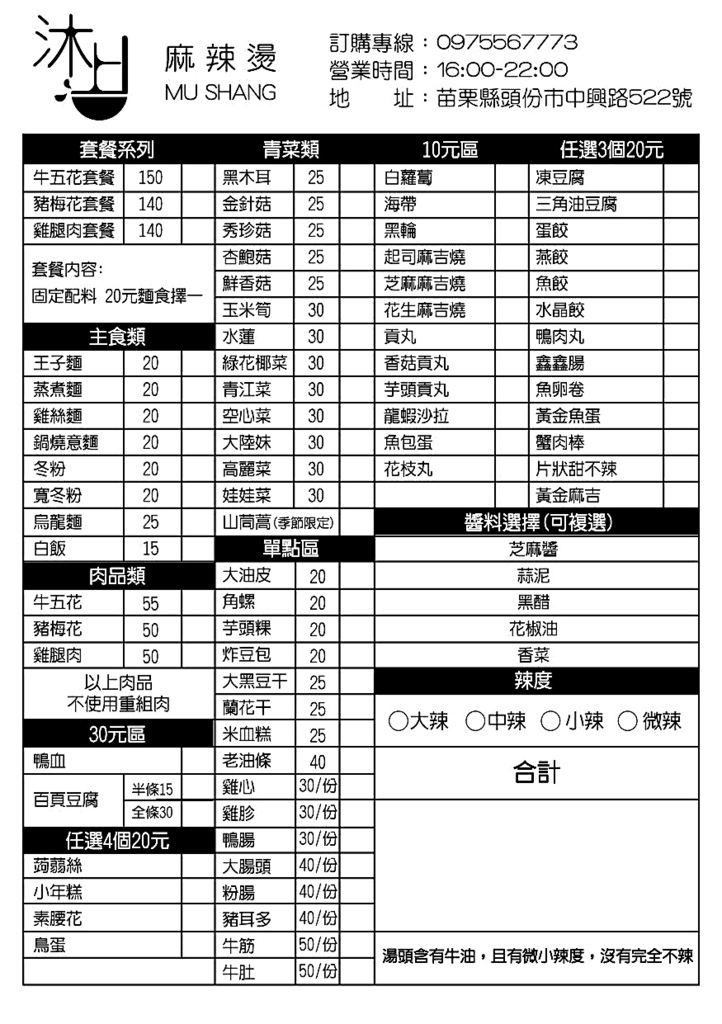 先附上價目表。「沐上麻辣燙」的醬汁和辣度都能客製化調整,其中套餐的主食可以從$20的麵任選一款,入內用餐低消 $100蠻親切 ! 湯頭沒有完全不辣的,但原味湯的辣度很溫和一點也不刺激,裡面添加些許牛油提味,鍋邊素的朋友一樣可以享用喔~