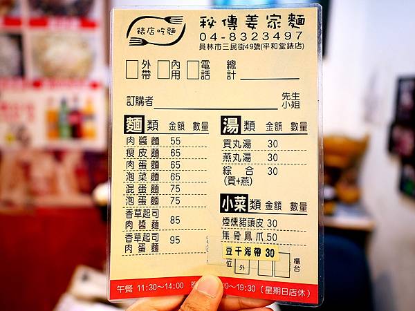 「姜家麵平和堂錶店」販售的品項不算豐富,主打多款拌麵和湯品。店內有餐點圖樣可以參考,看過再點比較能符合自己的期待~