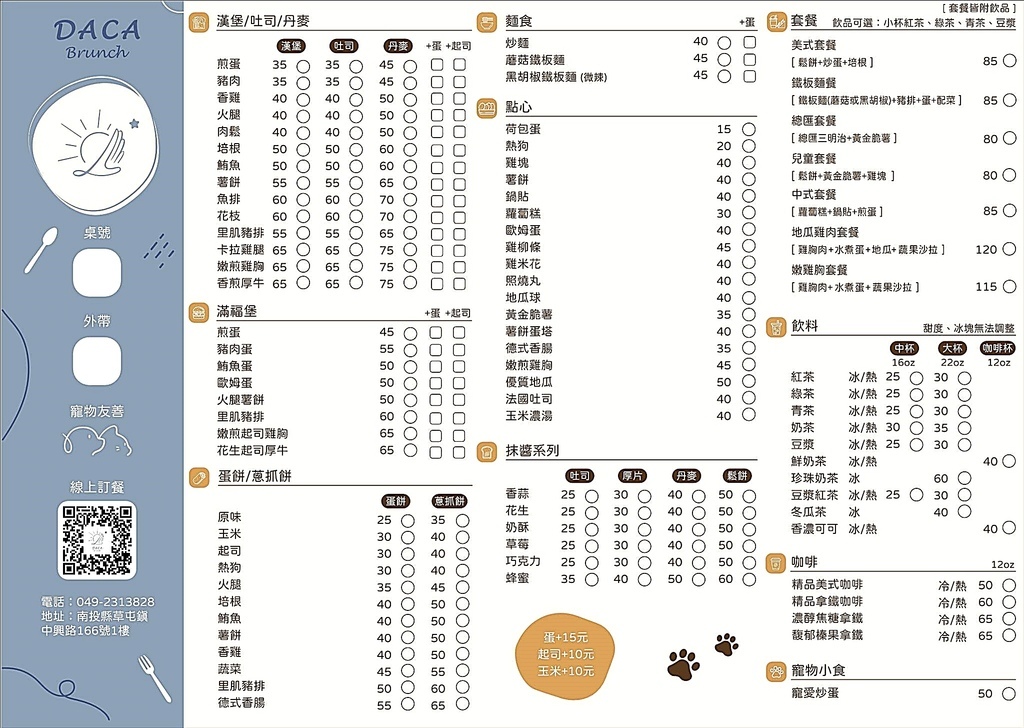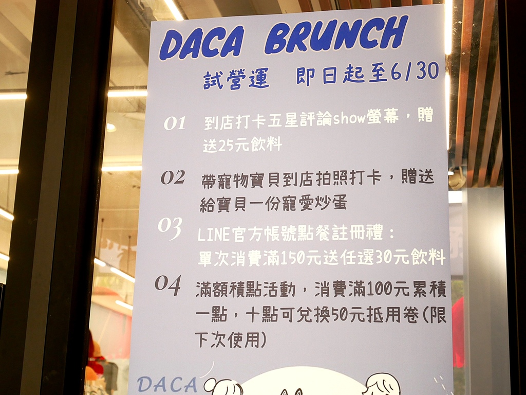 靜香家的慕斯太膽小,所以就沒帶他前往用餐,但還是幫各位毛爸毛媽們詢問一下寶貝入店的資訊。「DACA Brunch 早午餐」有提供毛孩落地,只要不影響其他用餐的客人即可,如果寶貝會亂跑的話還是要有牽繩喔。店內有提供寵愛炒蛋但沒有強制點餐,還是可以帶寶貝習慣的食物,這點蠻貼心的。