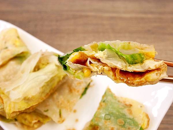蛋餅皮不夠酥但整體口感不差,蔬菜口味的份量還不小,裡面搭配新鮮的美生菜和玉米,中間淋了些甘甜油膏增添濕潤度和鹹香很加分,如果皮再酥一點就更棒了。