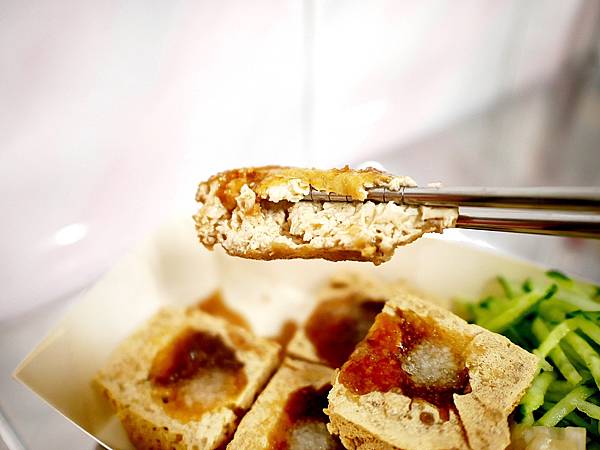 「阿西臭豆腐」的豆腐偏小塊,但炸到酥脆且外酥內嫩又多汁我喜歡,中間淋的醬油提味不死鹹,上頭的蒜泥也很加分,就是豆腐本身臭味不夠重,不然還蠻好吃!