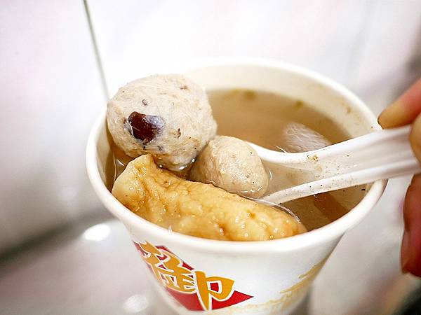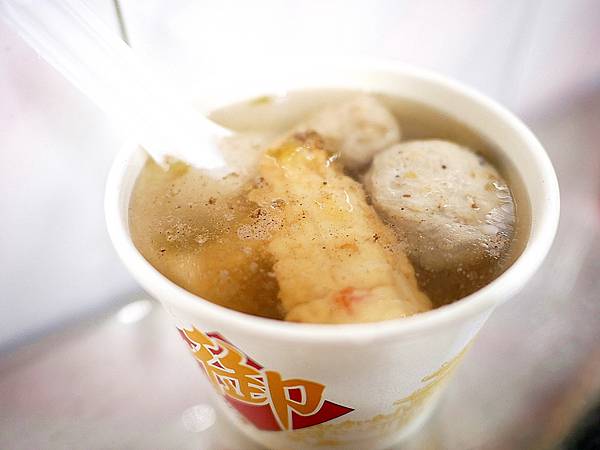 綜合湯裡面有一整條黑輪跟兩顆丸子,湯不算大碗湯頭也是清爽平淡的路線,但感覺是蔬菜的清甜味還算耐喝,就是胡椒加太多把甜味都蓋掉比較可惜。