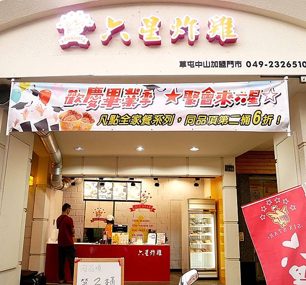 「SIX STAR 六星炸雞」草屯店位在中山街上,店面內縮沒有很顯眼,好險有活動都會掛上布條蠻醒目。