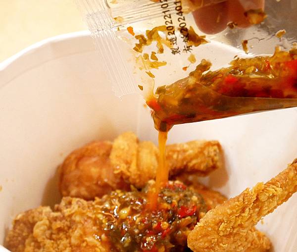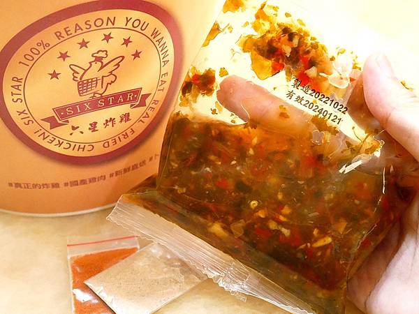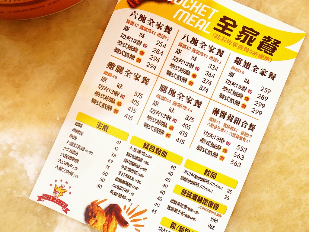 先附上菜單,「SIX STAR 六星炸雞」主打炸雞桶,也有一些點心可以選,但跟一般炸物店相比選擇沒那麼多。除了原味之外,也有撒粉的「功夫13香」和淋醬的「泰式椒麻」和「韓式首爾」等異國風味,打電話去訂餐的時候,店家說同價位的可以搭配,但我對泰式比較有興趣,所以兩桶都選態勢椒麻醬。