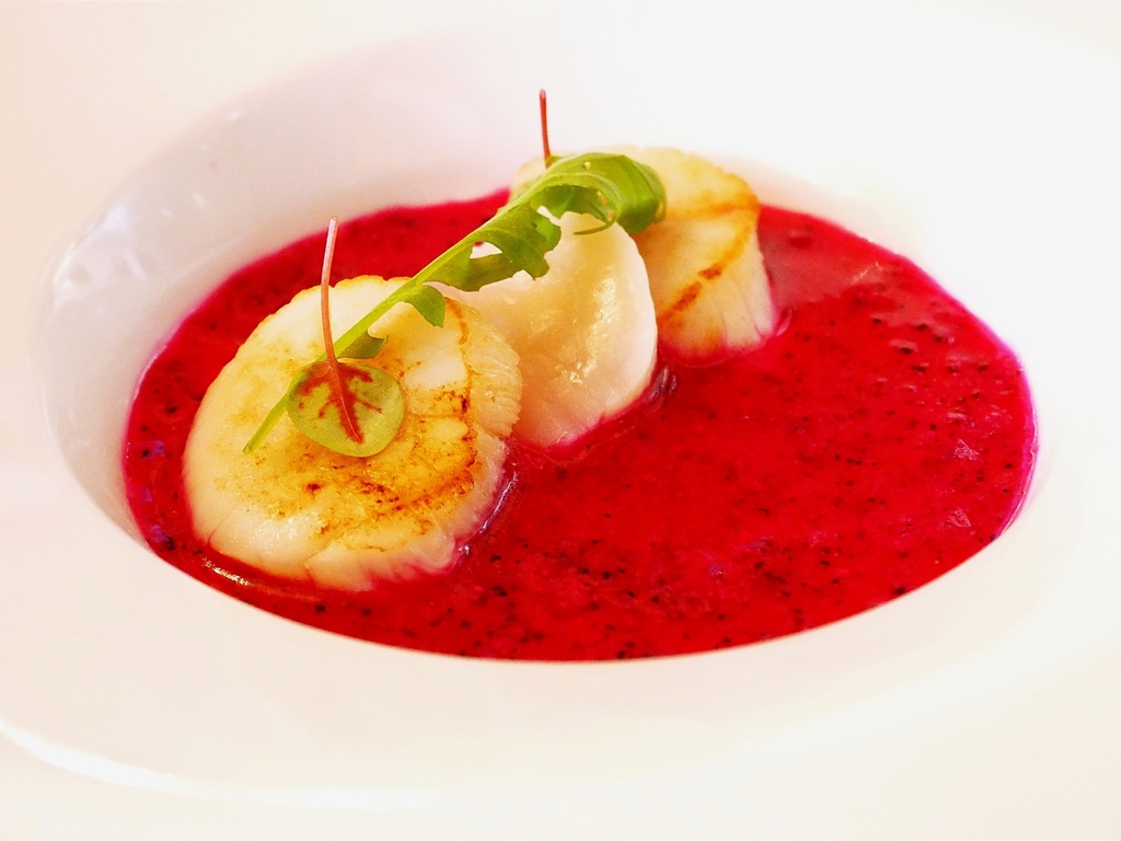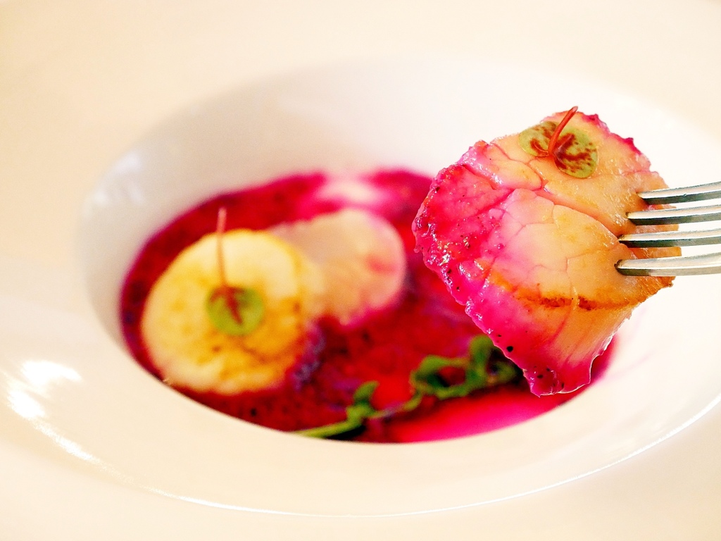 入口能品嘗到豐富堅果和奶油香氣,蠻令人驚喜! 搭配煎上色的生食級干貝,細緻鮮甜的口感蘸著帶點果香的醬汁特別清爽開胃,這道我蠻喜歡。