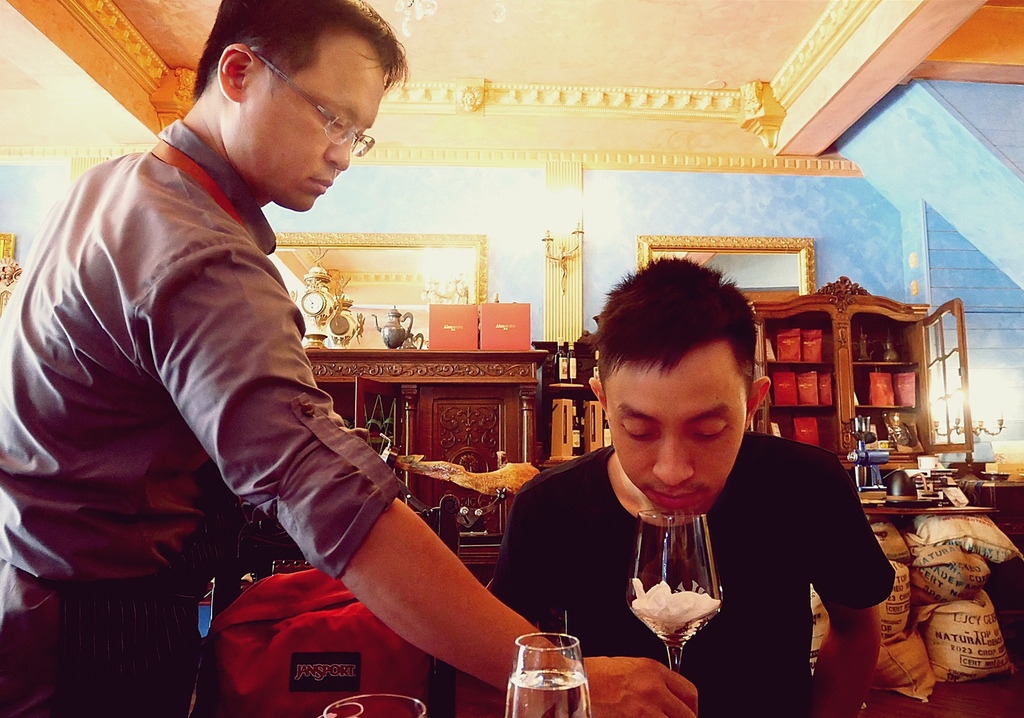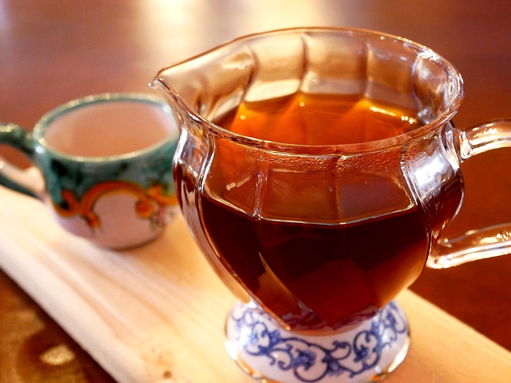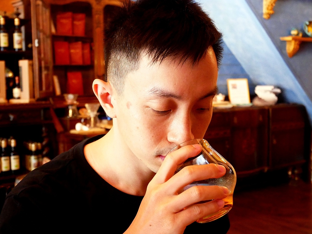 除了餐點講究,餐具的選擇也是一大學問。以杯壁較薄的水晶聞香杯裝茶,即使是口感淡雅的茶,聞起來香氣也變得豐富。這款以阿里山小葉綠禪咬過的葉子製茶,雖然口感不算濃醇但帶有豐富蜜香,佐餐還算不錯。