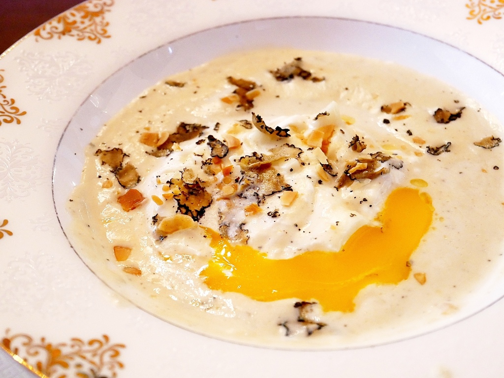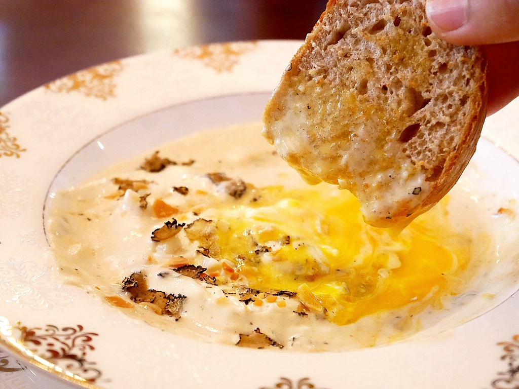 松露蛋是一道經典義大利料理,以當地產的起司加入奶油和松露熬煮而成,質地濃郁不厚重,中間置入的水波蛋劃開很流汁,拌著上頭的松露片和杏仁片一起入口相當有層次。