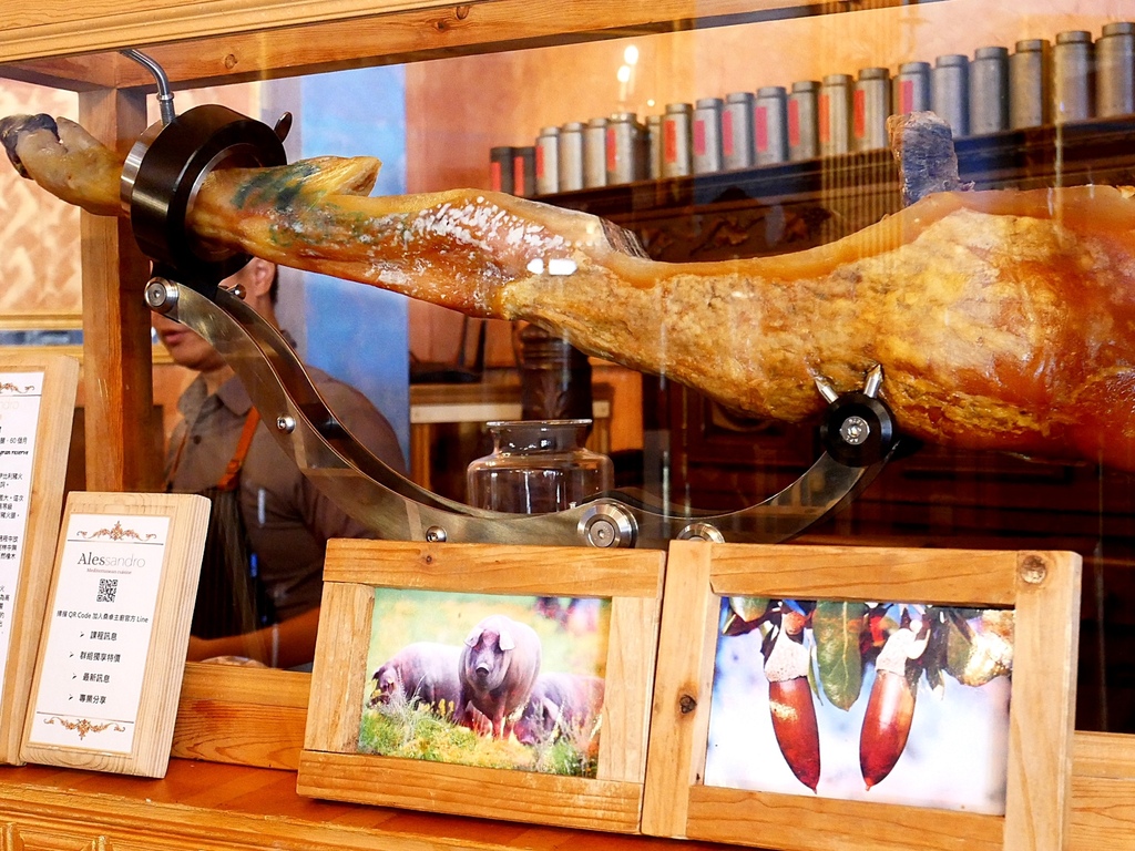 「桑卓主廚地中海料理」有個鎮店之寶,整支100%伊比利豬橡樹級火腿!! 伊比利豬單價本來就比較高,其中又以從小就放牧,且食用天然花草和野生橡樹的橡樹級伊比利豬最為珍貴。