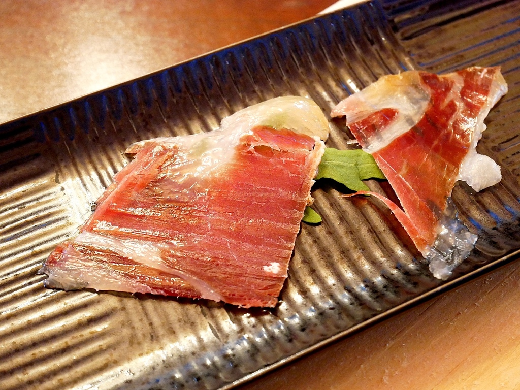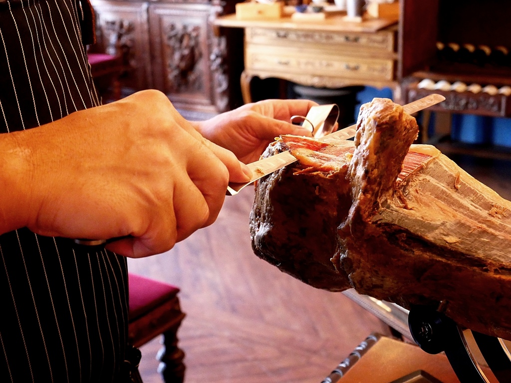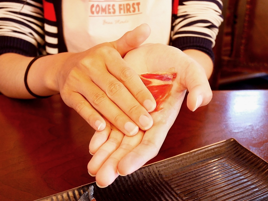 伊比利現切火腿的油脂很豐富,吃之前要把火腿置於手掌之間,利用手的溫度讓油脂風味更凸顯。