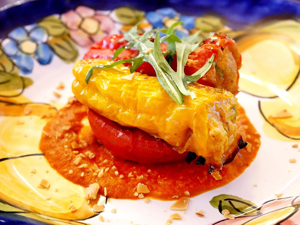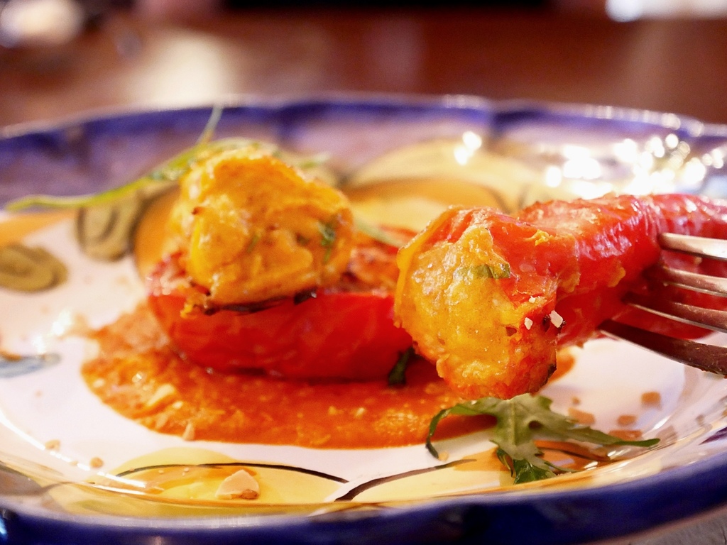 這道看起來很樸素,但卻藏了許多工法在裡頭。在甜椒內填入蝦漿去烤,外軟嫩內Q彈而且咬下蠻多汁,底下的烤番茄酸香濕潤也好吃。