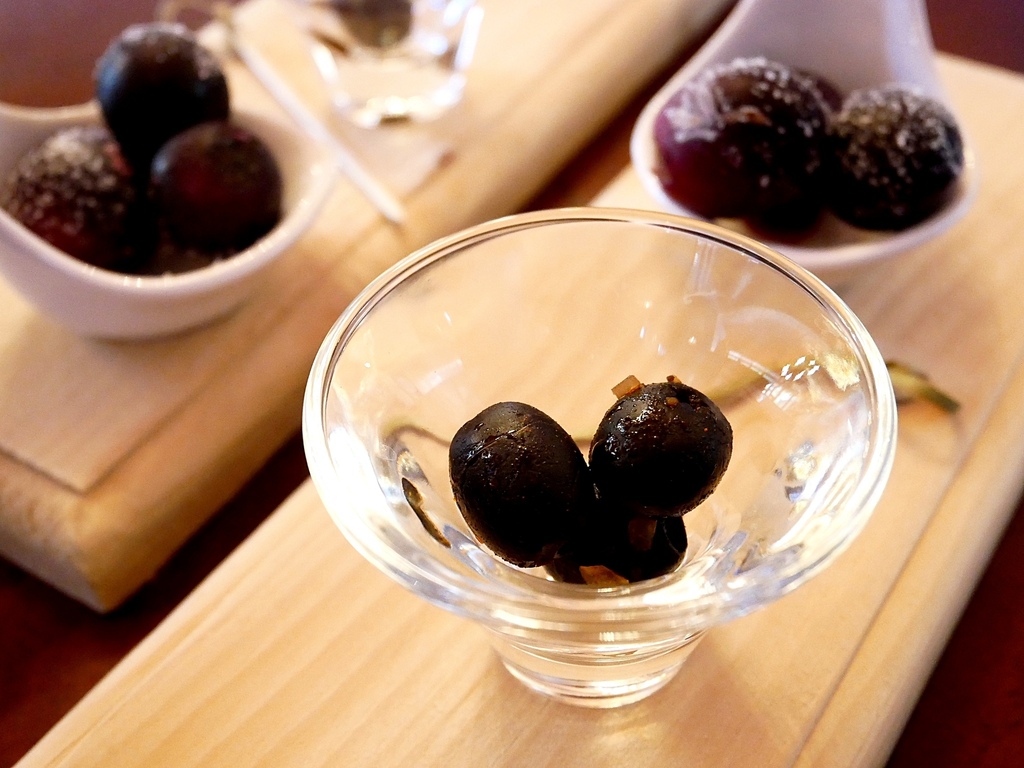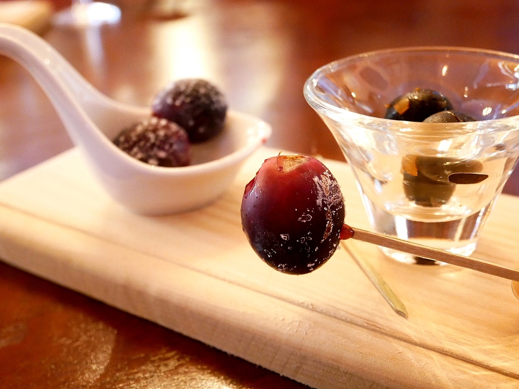 進入主餐之前先來點開胃的義大利小品,分別是南義和北義在地經典點心,以盛產的水果製作,包含漬橄欖和烤葡萄。橄欖是以香料、蒜頭、橄欖油和辣椒醃漬而成,煙燻味很濃郁,不會太酸但帶有豐富的鹹香味,意外重口。