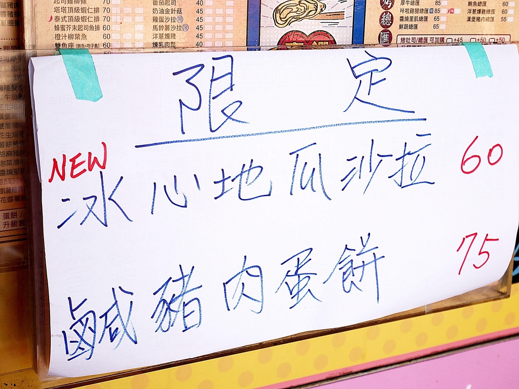 先附上菜單,「喜饌晨食」的餐點品項非常豐富,除了人氣的酥皮蛋餅之外,也有吐司、漢堡和各種炸物點心等等。看到櫃檯的公告說之後以蛋餅為主,吐司過陣子會取消掉喔~