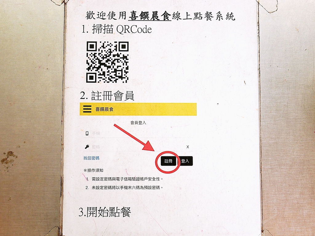 「喜饌晨食」有自己的點餐系統,掃描Q.Rcode到系統內,第一次使用需要註冊,之後直接點餐即可。不僅免到場等待,甚至可以前一天就下單,不過系統會預留半個小時的製作時間,老闆說如果希望快速取餐,記得備註一下~