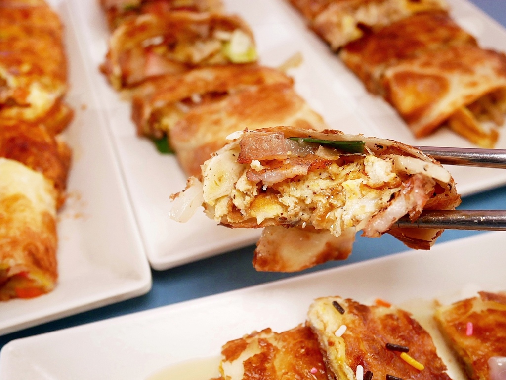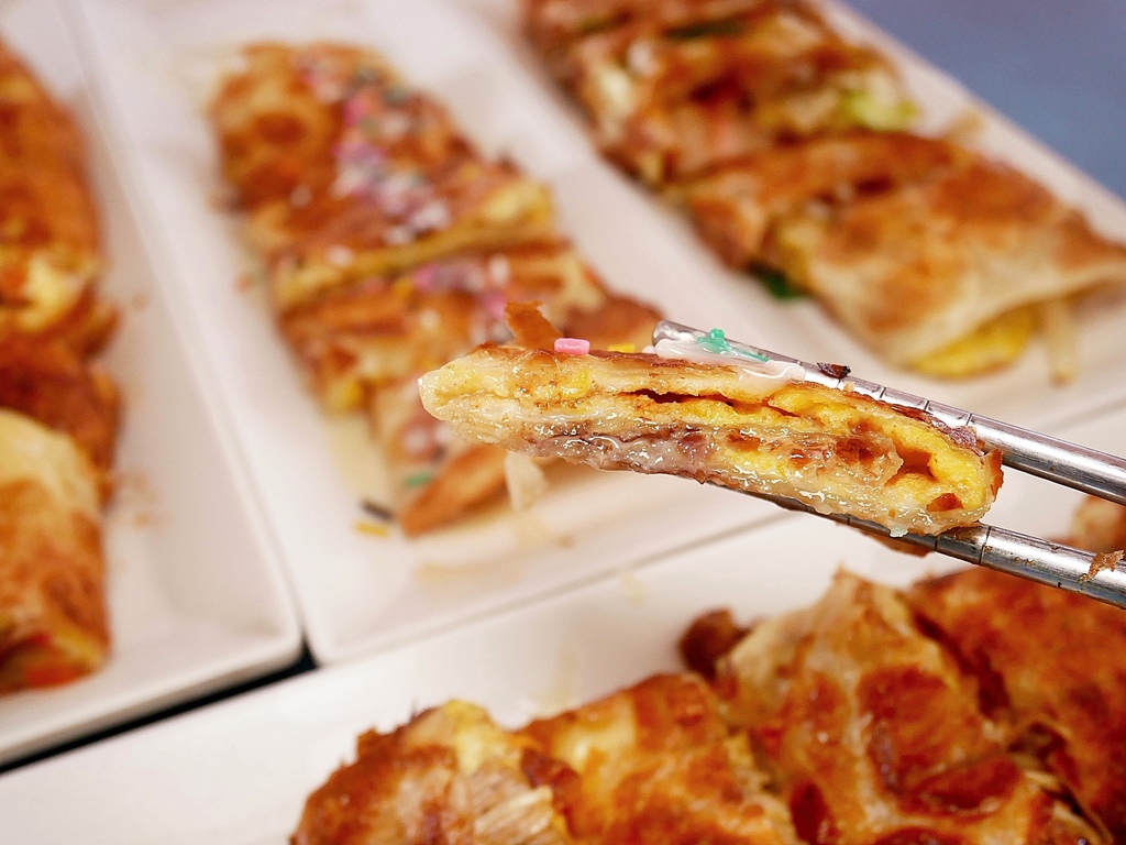 喜饌晨食的蛋餅光看表面就知道很酥脆,煎到恰恰很上色,對於酥皮蛋餅的愛好者超有吸引力。蛋餅皮相當薄蛋完全不會乾,即使慢慢吃放涼了依舊好吃,重點是每一款的料都給得大方,超有份量不空虛。