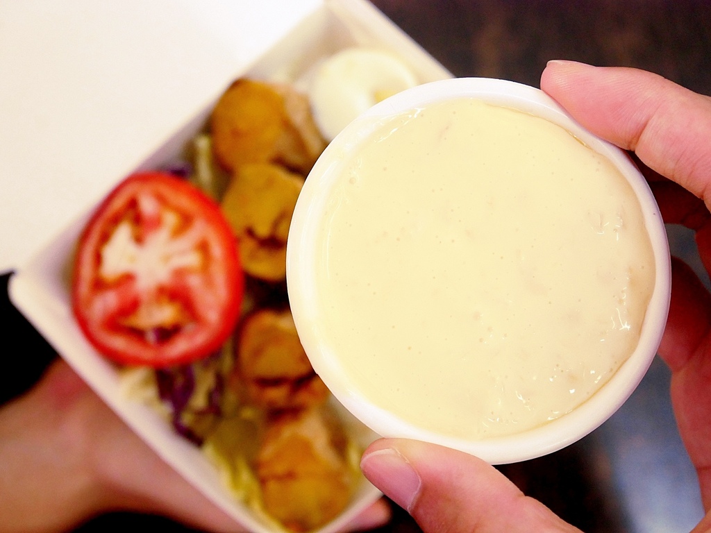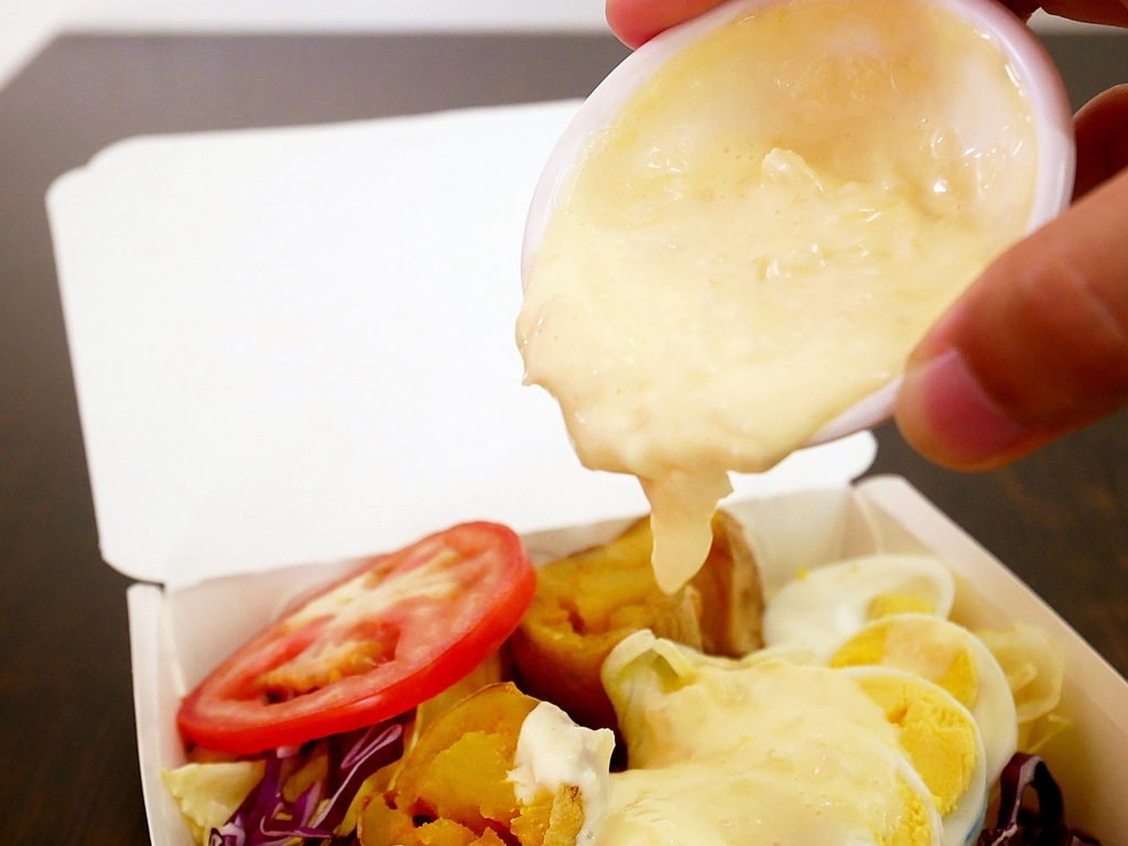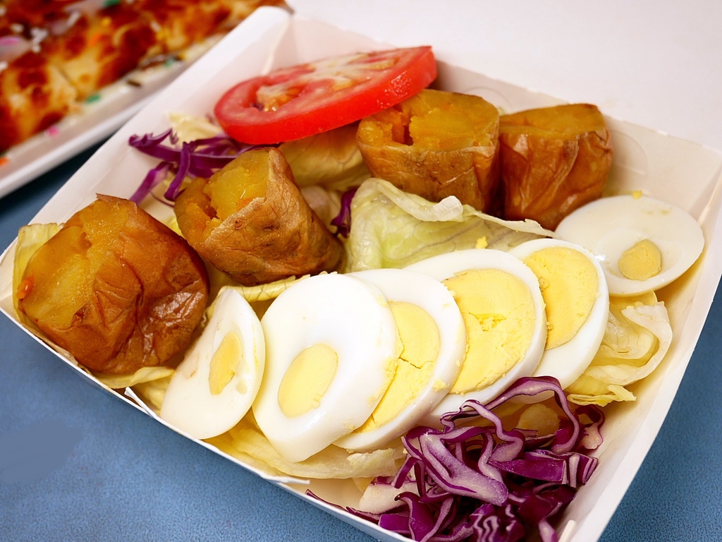 夏天熱到沒胃口,來份吃得飽且營養均衡的沙拉最適合。以大量生菜搭配水煮蛋、地瓜意外飽足又不失輕盈。裡面的生菜很新鮮,而地瓜纖維細緻不會乾,單吃就很有味道,淋上醬汁更提味。