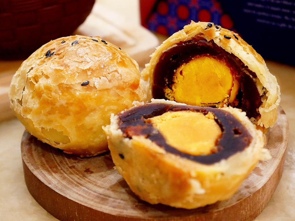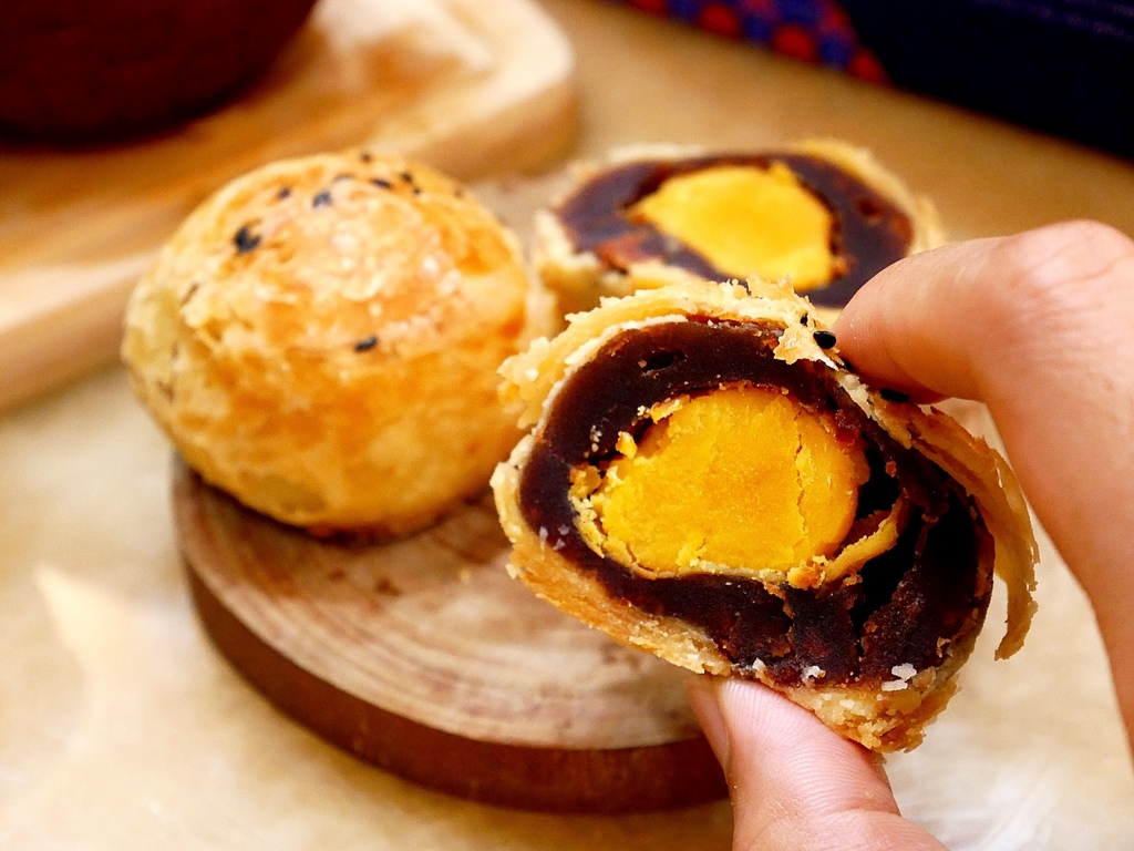 蛋黃酥還不小顆,雖然底部比較厚一些,但吃起來不會太乾,整體口感偏脆。豆沙餡細緻不甜膩,中間的鹹蛋黃不會泛油,味道還不錯相當耐吃。