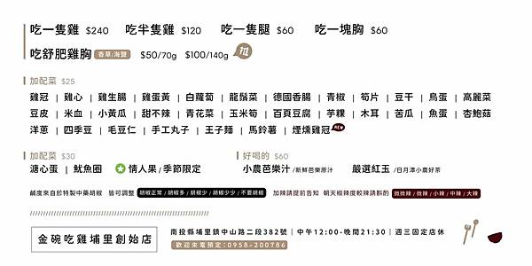 埔里鹹水雞還不少間,原本隱身在墊腳石外的「金碗吃雞」雖不顯眼卻是在地人氣小攤。配菜種類多樣化且通通均一價,除了常見的內臟、蔬菜之外,手工丸子和滷豆干、豆皮都是人氣必點,最特別的季節水果滿百免費送,讓本就清爽的鹹水雞更添輕盈。埔里金碗吃雞特製的中藥胡椒及手炒朝天椒,是酷暑之下最棒的消暑「涼伴」,重點是中午就開賣,熱到沒食慾直接來一份。