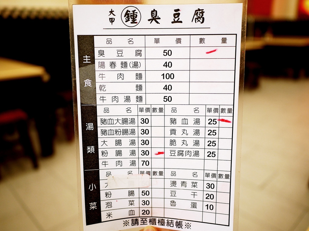 大甲的小吃還不少,上網一查超多名單待蒐集。文武路的「大甲鍾臭豆腐」據說是在地老字號,從攤位賣到店面人氣還不低,看GOOGLE整體評價還不錯,就放心來嘗鮮。這家的臭豆腐口感跟一般吃到的很不同,豆腐肉有點像千層豆干,層層疊疊蠻吸湯汁,但絕對要趁熱吃才美味。