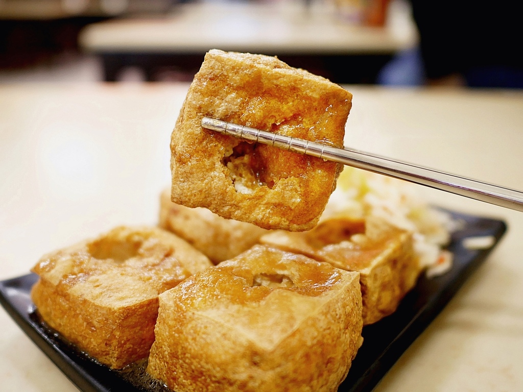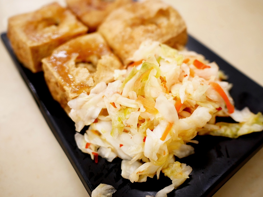 臭豆腐趁熱吃外軟酥內濕潤還挺多汁,中間的豆腐肉有點像千層豆的口感,跟一般的略有不同,口感不差還蠻有特色。只是臭味不算濃郁小小可惜,稍微冷掉皮就會變韌,一定要盡快享用。