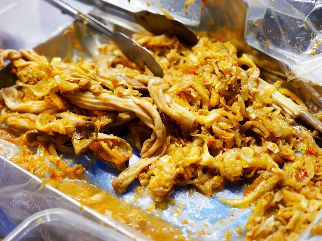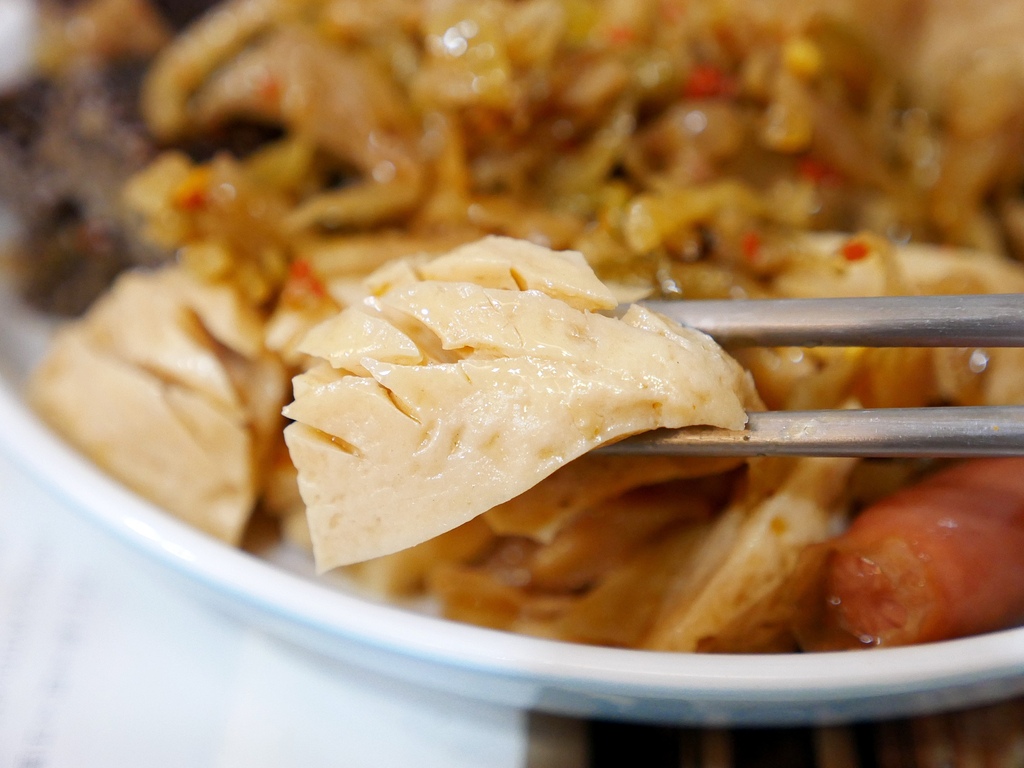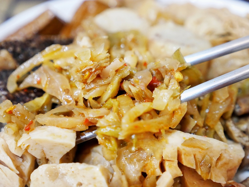 點滷味就免費送辣酸菜,酸菜有洗干淨再製作,沒有生酸菜的那個怪味道。帶點淡淡辣椒香氣不刺激,酸度也很適中,纖維不會太粗,配著其他東西一起吃很不錯。