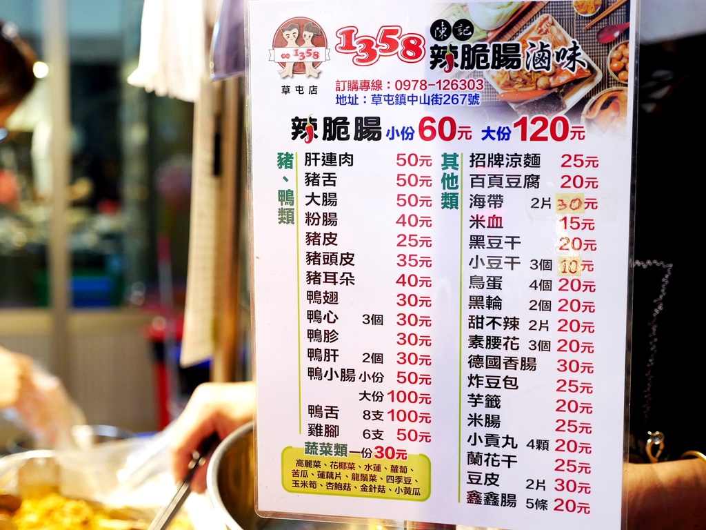靜香又來踩點草屯新店啦!中山街上新開一家 1358辣脆腸 ,前陣子他的促銷優惠沒跟到,前兩天經過立刻停下來朝聖一下。1358冷滷味的食材都蠻新鮮,雖然滷汁不重口但很耐吃,會吸湯的食材都很值得來一份。