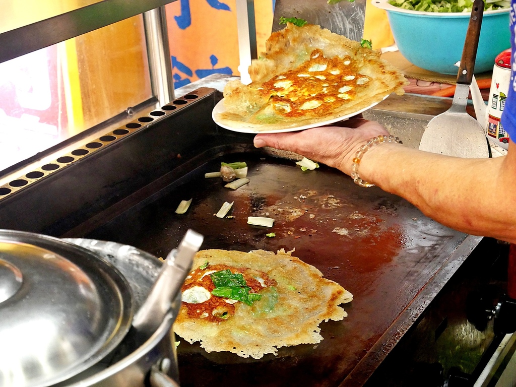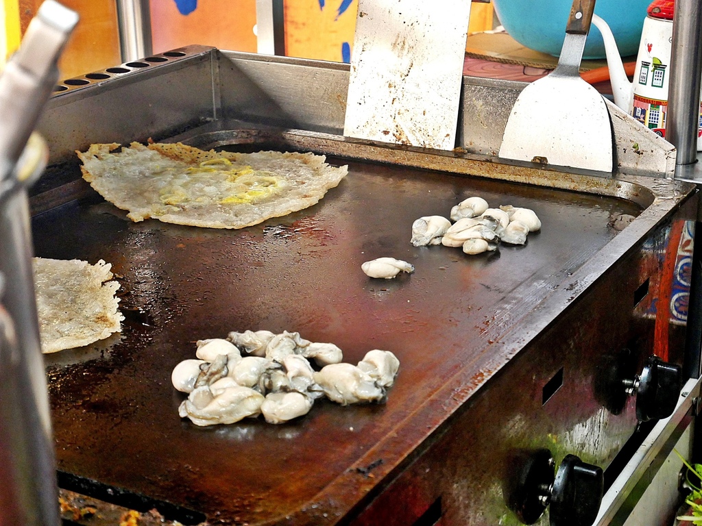 等在煎台旁看老闆料理,只見肥滋滋的蚵仔陸續上鍋,與炙熱的鐵板碰撞出悅耳的聲音。