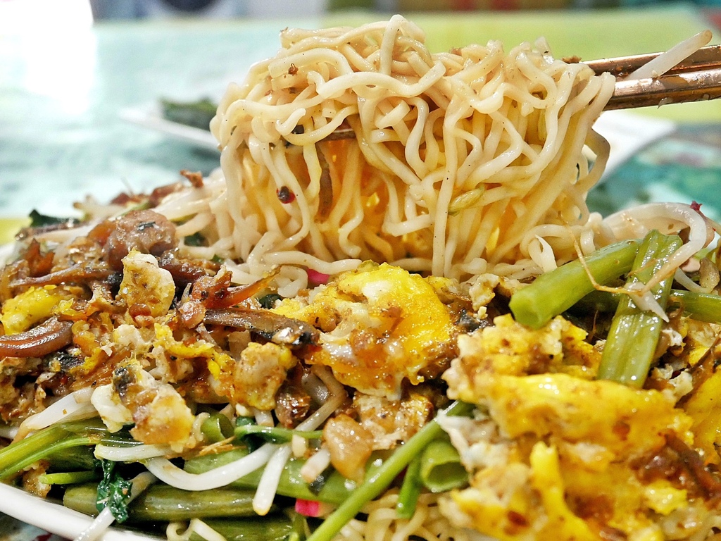炒泡麵超大一盤,裡面料給得大方。除了滿滿手抄XO小魚干貝醬之外,還有蛋、蔬菜、魚板等等,每一口都有料。