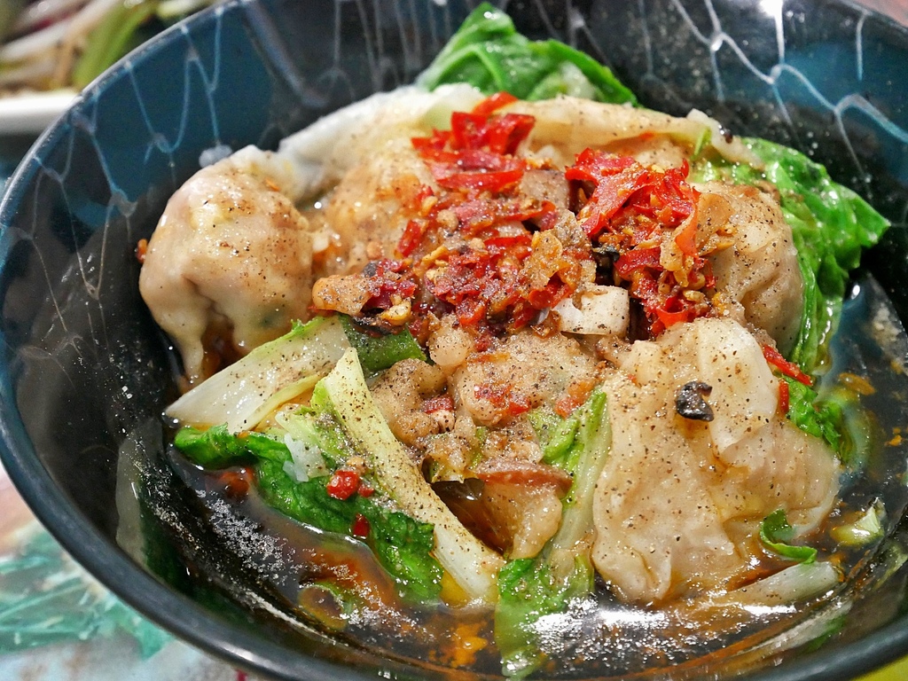 店家的紅油抄手是以自己做的辣椒醬製成,雖然看起來不像外面的紅油抄手那麼紅通通、油膩膩,但是辣度絲毫不遜色,裡面更拌入豆干味道還不錯。