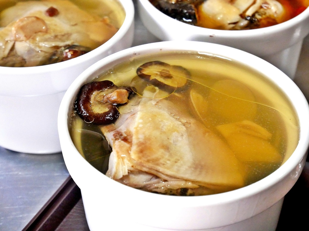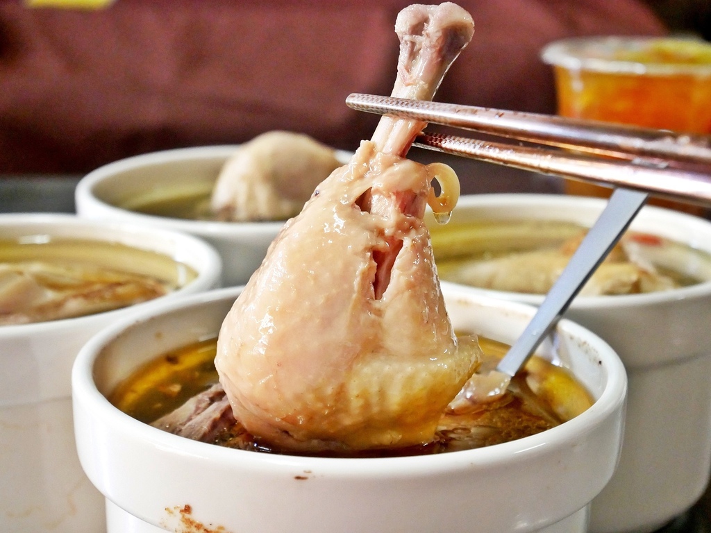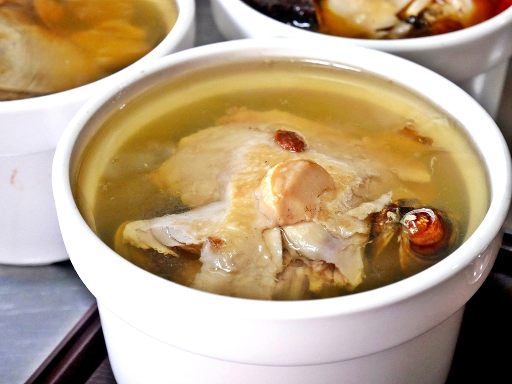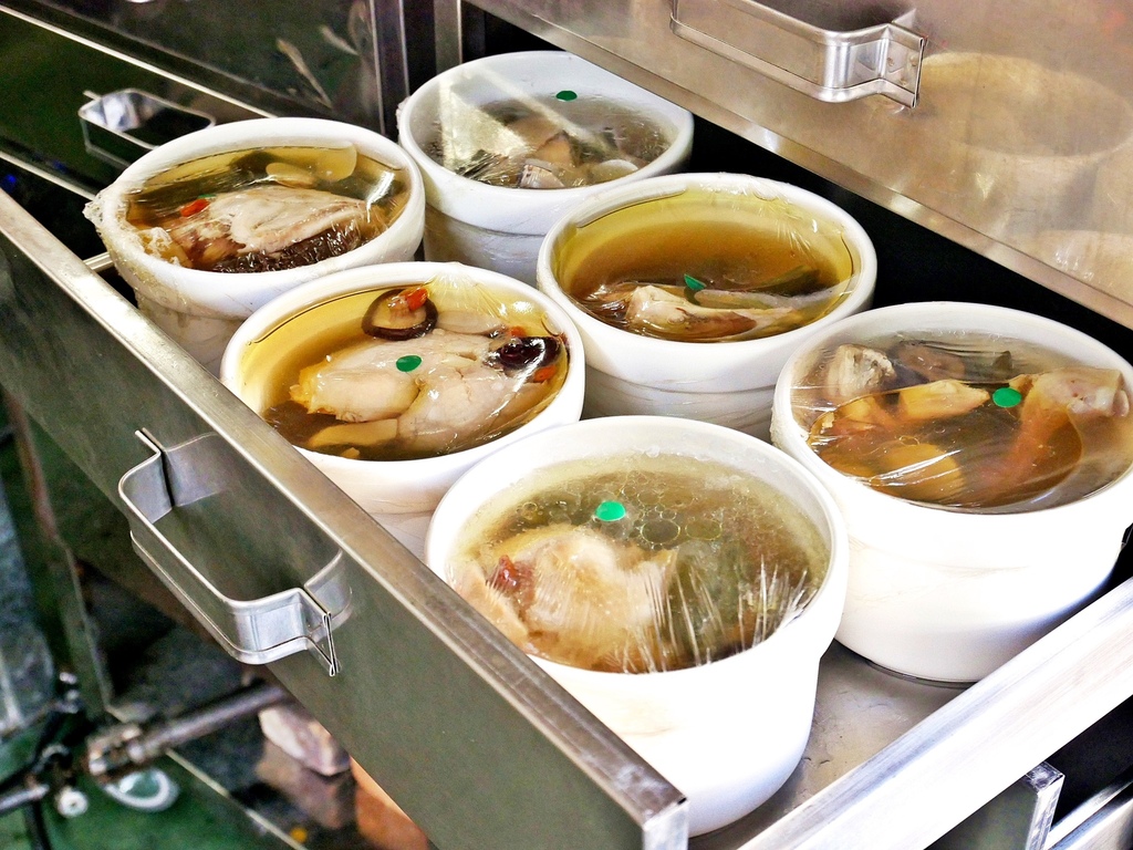 燉品一甕甕置於蒸籠內保溫,這樣顧客不管多晚來買雞湯,依舊是熱騰騰的狀態。還沒開吃就知道雞湯料多實在,雞腿都快衝破保鮮膜而出。