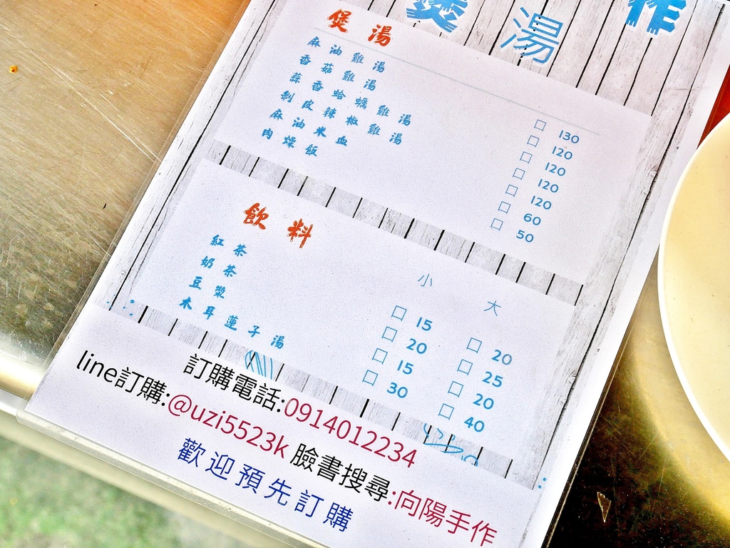 先附上菜單,店內除了販售雞湯之外,還有肉燥飯、木耳蓮子湯等等。如果怕晚去想吃的口味賣光光,可以提前透過Line或電話請老闆預留,才不會白跑一趟! (目前沒有賣麻油米血,但多了手作湯包 )