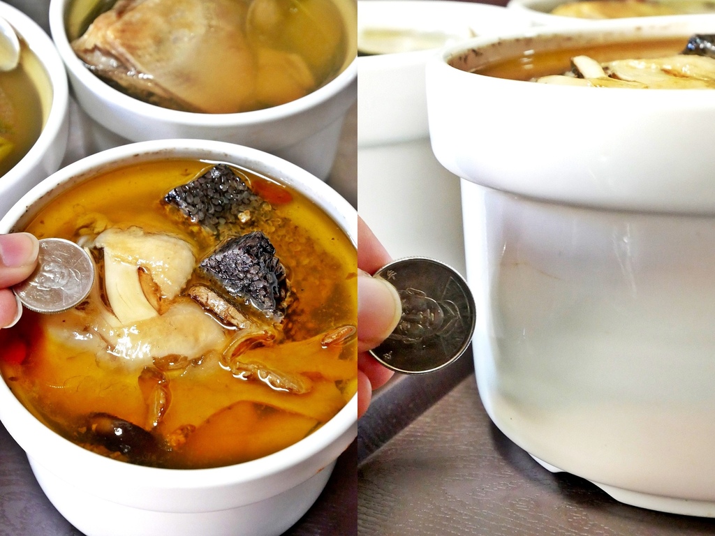 不得不說店家的雞湯真的很大一碗,用10元硬幣當比例尺就知道這個size多驚人,比一般燉品店的雞湯大不少。
