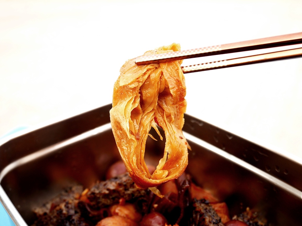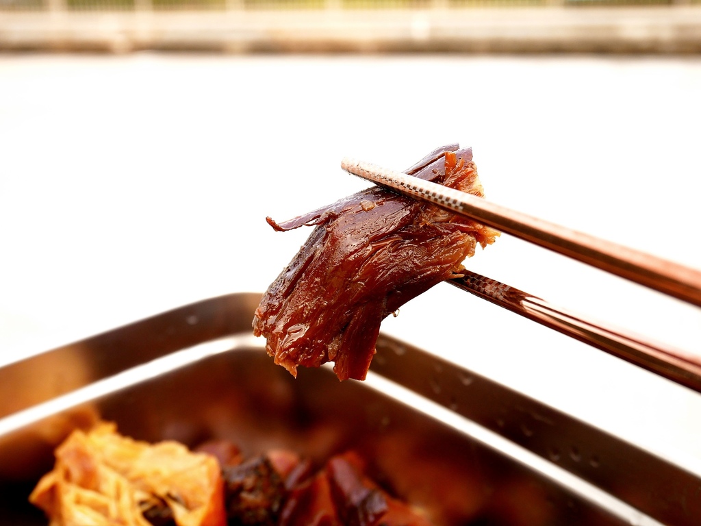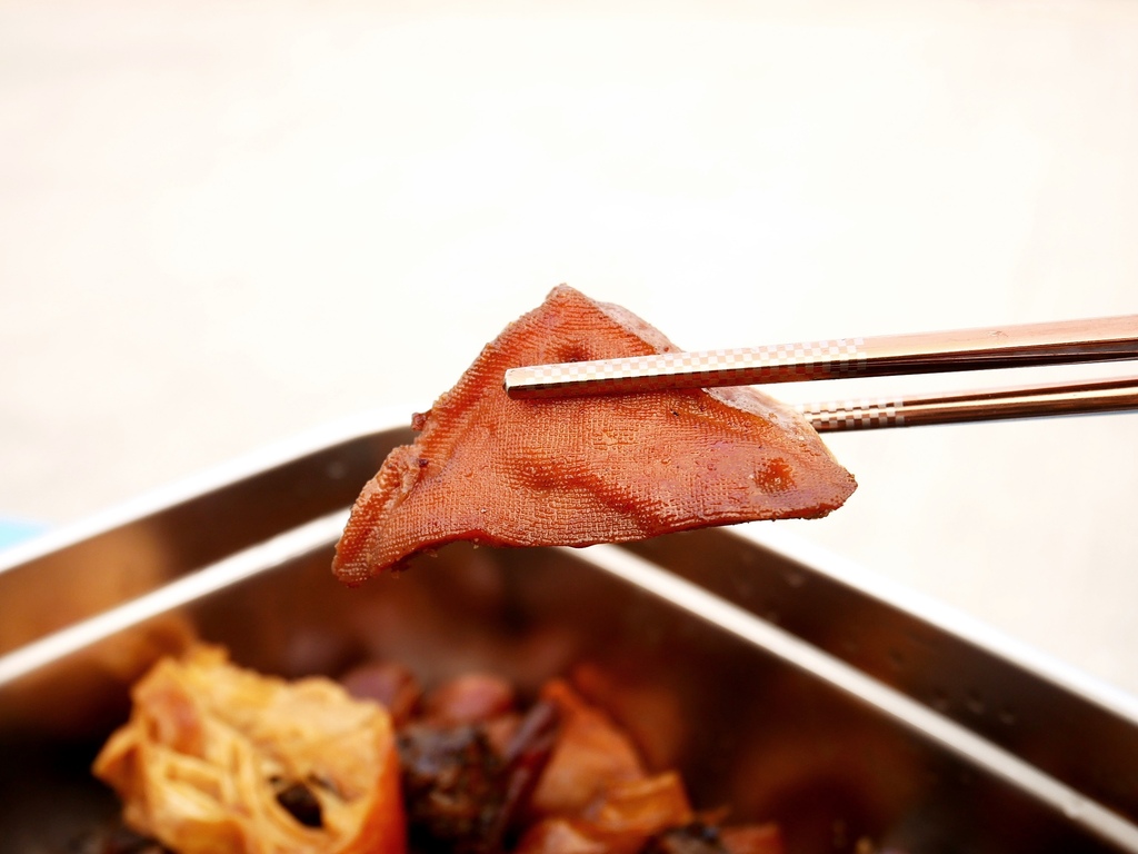 鴨腱帶我每次看到滷味、東山鴨頭有賣必夾,但他家的鴨腱帶吃起來不是預期中Q彈路線,比較偏紮實又帶點嚼勁,雖然滷到鹹香入味很涮嘴,但口感若能再細緻些就更完美了。