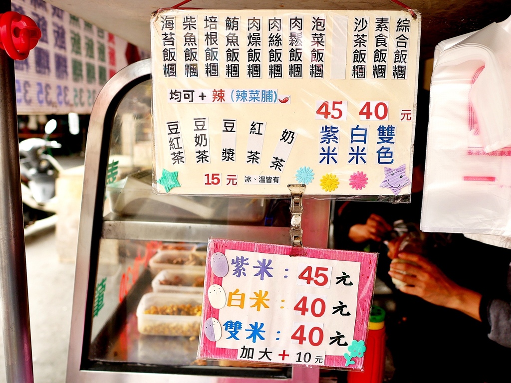 附上中興飯糰價目表,不管挑選什麼口味價格都一樣,白米、雙米的都是40元,紫米則是45元,如果要加辣菜脯記得在點餐時就告知喔!