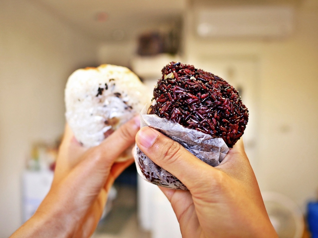 靜香大愛紫米的脆口,而男友則偏好白糯米的香氣,所以每次都是買一白一紫。因為靜香不愛油條,所以少了油條的飯糰看起來小一點,並非店家原本的規格!