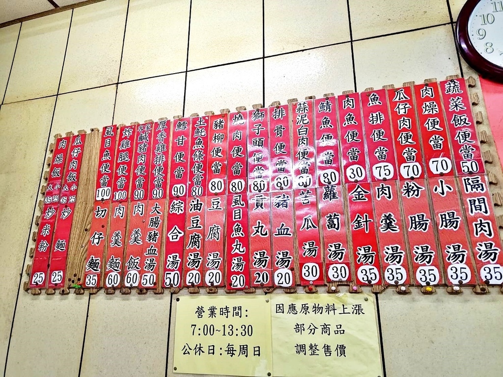 先附上價目表,店家的售價蠻親切,無肉的蔬菜便當只要50元,而含肉食的排骨便當、雞腿便當等等,則是70~100元。底下各種湯品還有左邊的飯食也都很平價,來這邊花不到100塊就能吃很飽。
