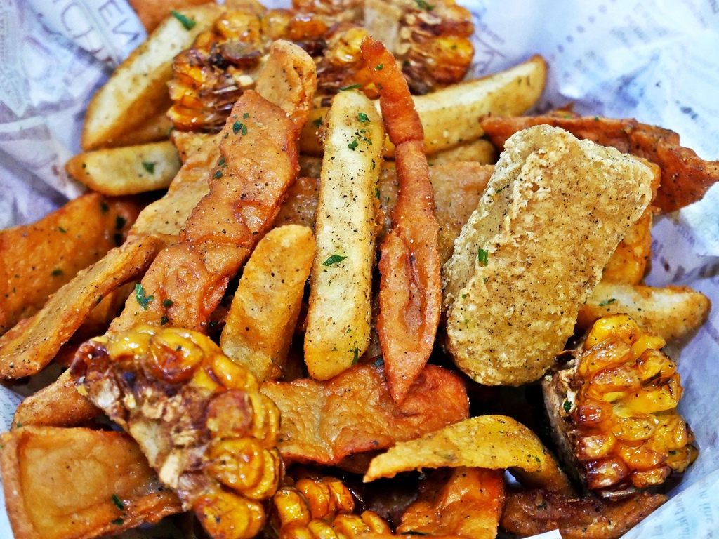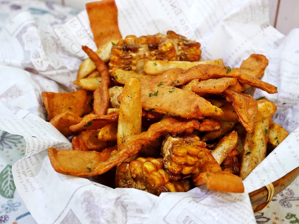 綜合炸物的內容包含馬鈴薯條、玉米、甜不辣和雞塊,炸物份量還不小,很適合多人分享。炸玉米很少見,清甜的玉米據說是來自小農,沒有炸到太乾很好吃。甜不辣切成薄片狀,炸起來軟Q又不難咬,連對甜不辣無感的男友都讚不絕口。