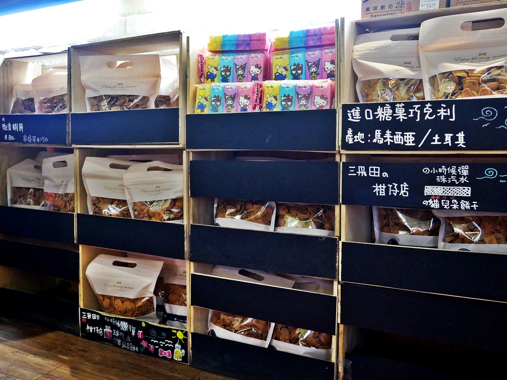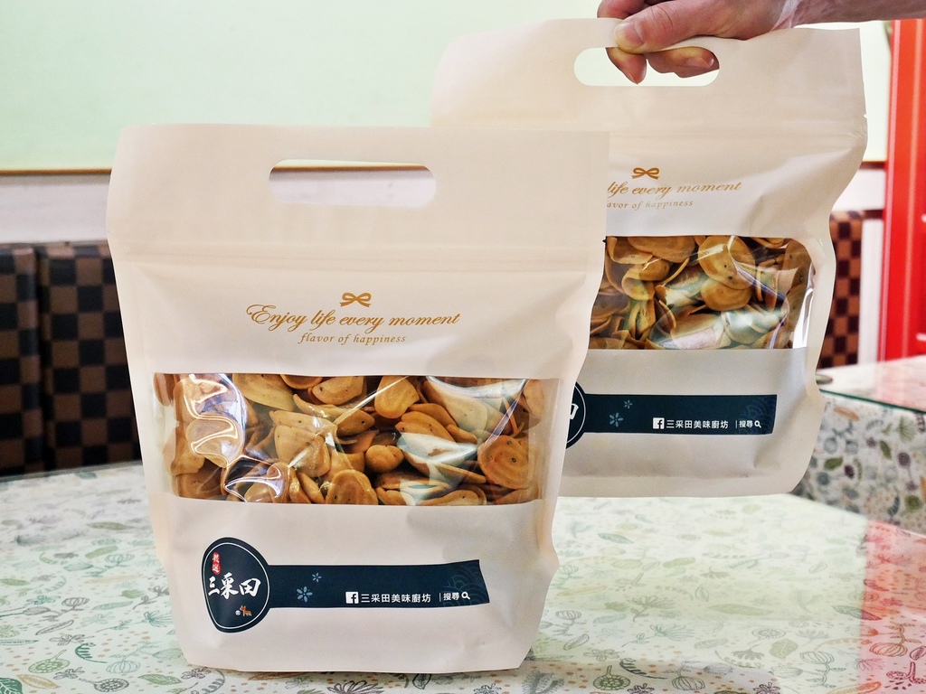 櫃台下方是伴手禮專區,一包包手工點心排排站,老闆說我們太晚來,每週二上架的蝦餅已經被搶光,想吃只能下次請早。