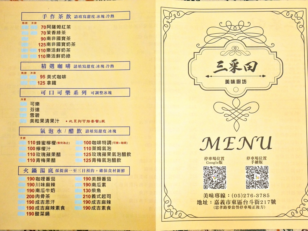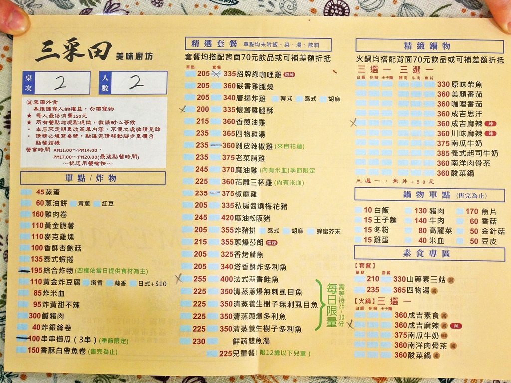 先附上三采田菜單,這邊有150元的低消,但沒有用餐時間限制。店內販售不少素食餐點,很適合帶吃素的朋友、家人一起來用餐。