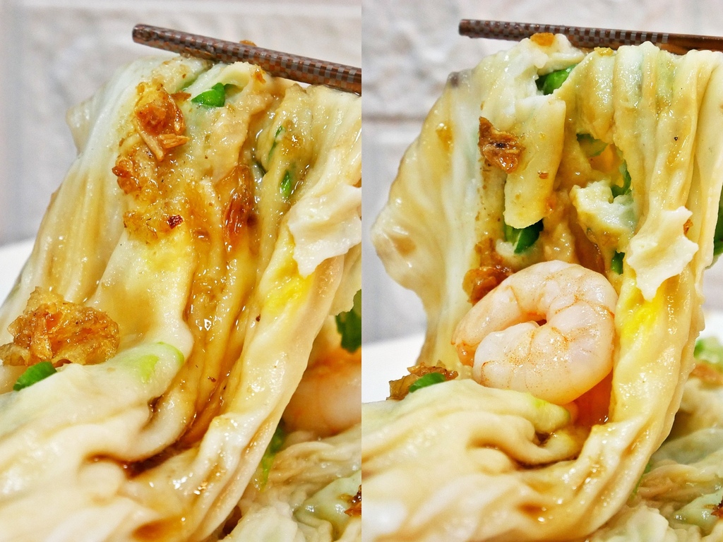 中間的蝦仁蠻大隻,不過肉餡不明顯,而蔬菜又因為太脆而太有存在感,整體來說不難吃,但口感略顯突兀。