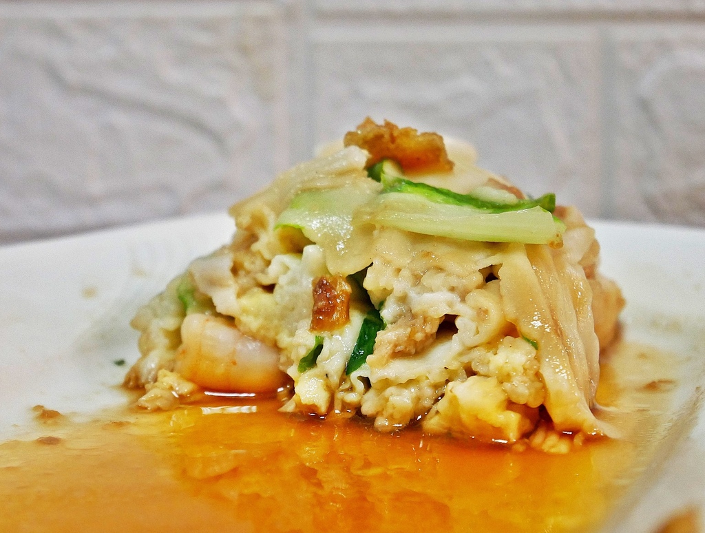 蒸食在的腸粉意外不小,外層粉皮的口感相當細緻,軟嫩適中略帶延展性,而且薄厚適中口感很不錯。裡面的蔬菜從薄皮透出色澤,淋上醬汁再鋪一些油蔥 (應該是) ,看起來很引人食慾。