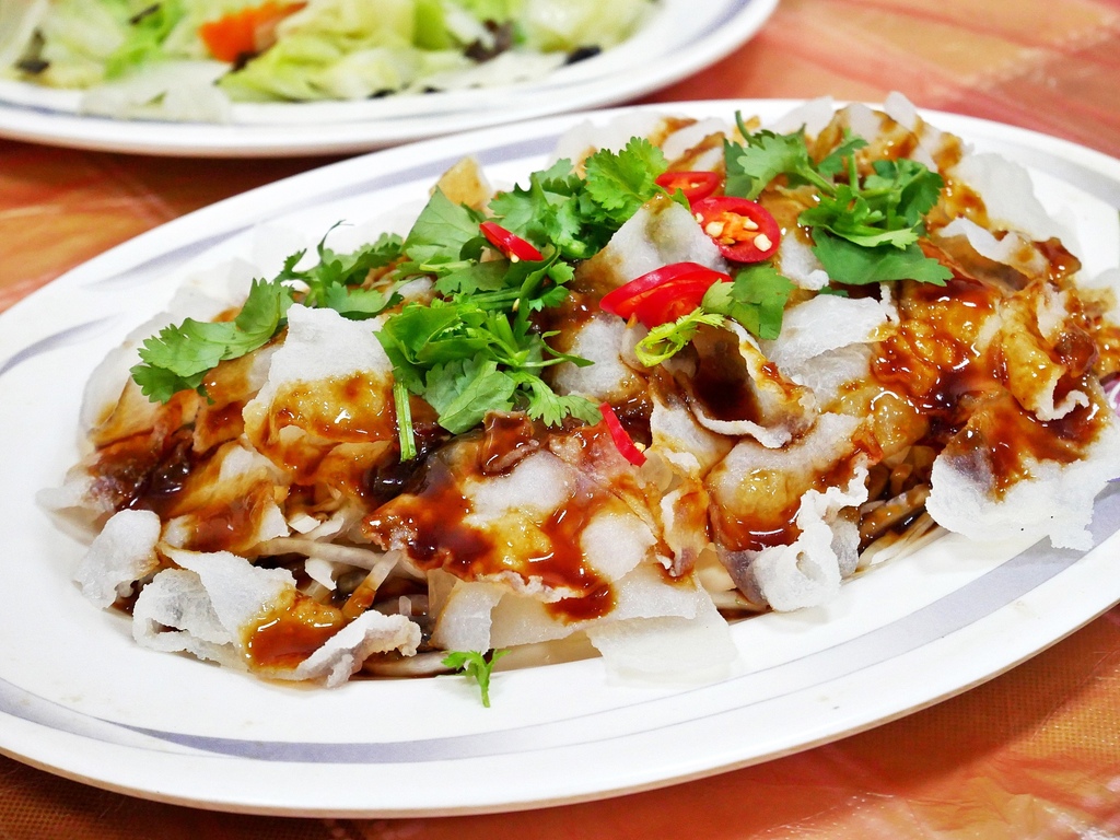 涼拌山豬皮就是這道,超薄切的豬皮炸過依舊清爽,微脆的Q彈口感讓人驚喜,拌著鹹香醬汁會想一塊接一塊。