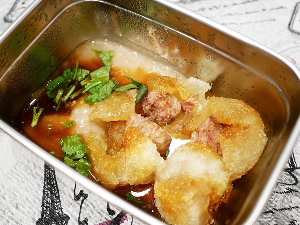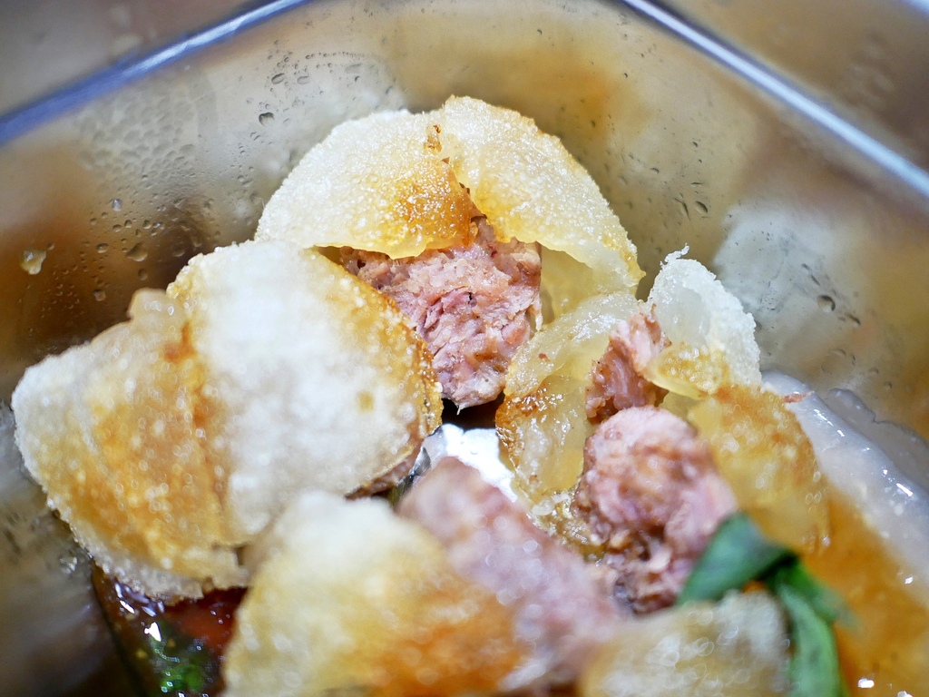 中間的肉餡調味還不錯,吃起來偏瘦卻不乾澀,連著酥脆肉圓皮一起品嘗超好吃。搭配上鹹甜不膩口的醬汁更添風味,我個人很喜歡。