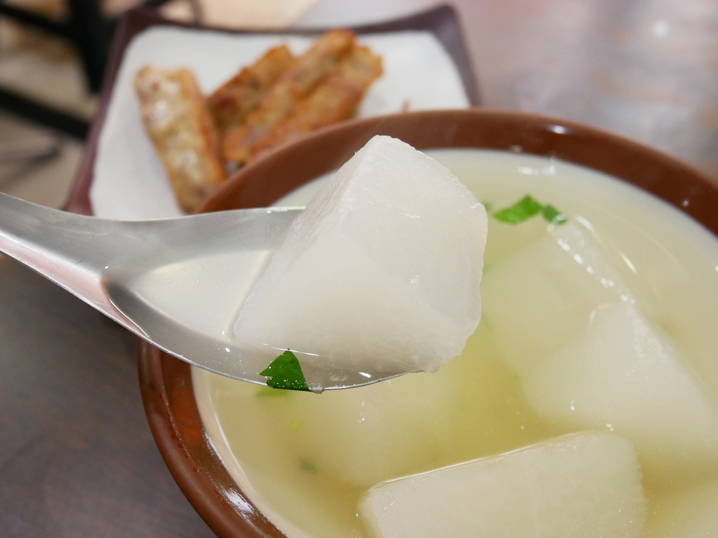 菜頭湯相當古早味,濃郁蘿蔔香氣搭配香菜提味很好喝。湯內的蘿蔔不只大塊而且分量還不少,點一碗搭配蘿蔔糕或芋頭糕都不錯。